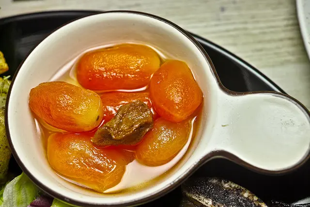 搭配的酸梅醃剝皮小蕃茄好吃爽口