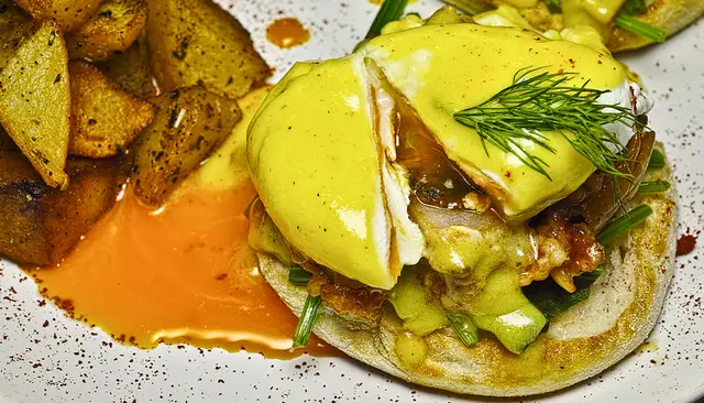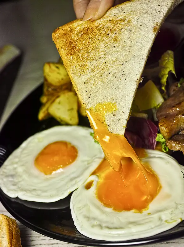 烤好的土司搭配荷包蛋鮮黃的蛋黃, 美味