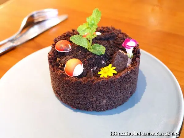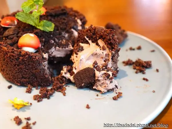 巧克力酥餅很脆,裡頭的慕斯柔滑順口,上面是巧克力瓢蟲與蘑菇,