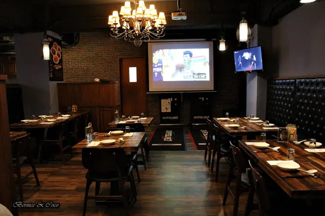 座位區有投影機和電視機還有飛鏢遊戲機