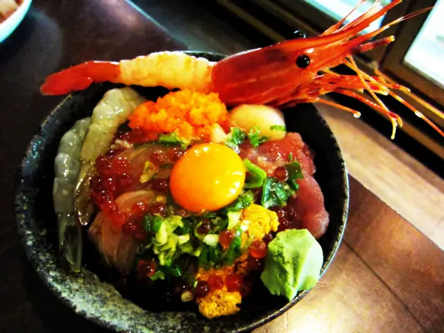 生魚片、海膽、魚卵、干貝及生蝦以及搶戲十足的牡丹蝦紛紛圍繞著黃澄澄的蛋黃...