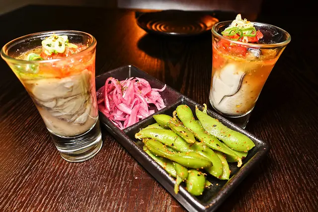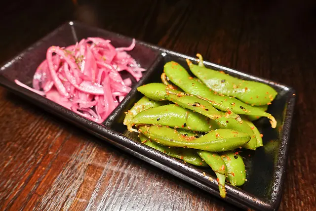 台灣居酒屋不像日本一樣喜歡給生的高麗菜, 這天慣例得到炒過的毛豆與醃洋蔥