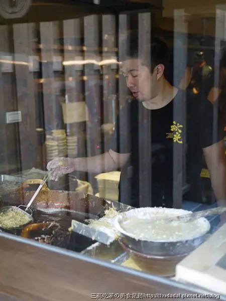 在炸之前谷原師傅會將麵糊甩入大銅鍋,印象中這是在確認油溫以對應食材,