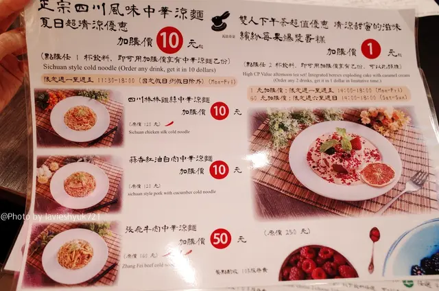 有麻辣鴛鴦火鍋已經讓我們很驚訝了,菜單一翻開竟然還有涼麵!!光看菜名就覺得很可口,而且限定時段點飲品~就可享$10元加購,這也太便宜了吧!!