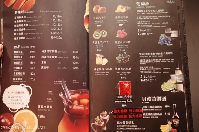 除了鮮果粒系列、茶、咖啡外,也有水果氣泡飲及強力推薦的綜合莓果奶蓋,更特別的是提供紅白葡萄酒、貝禮詩奶酒調酒,風格超多元。