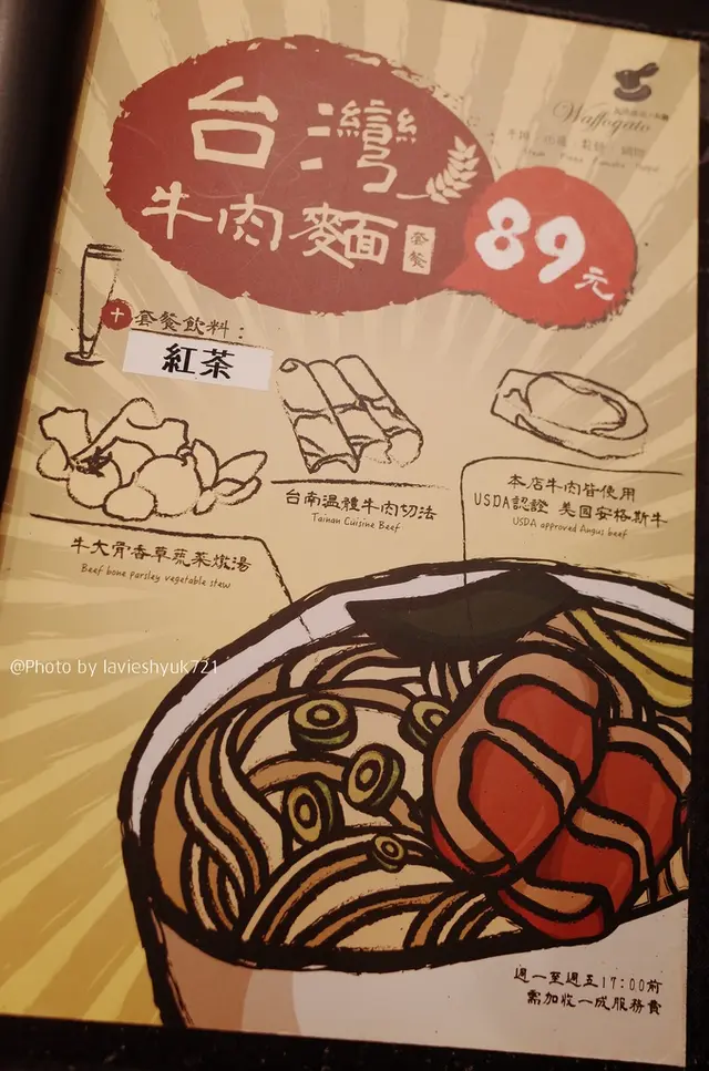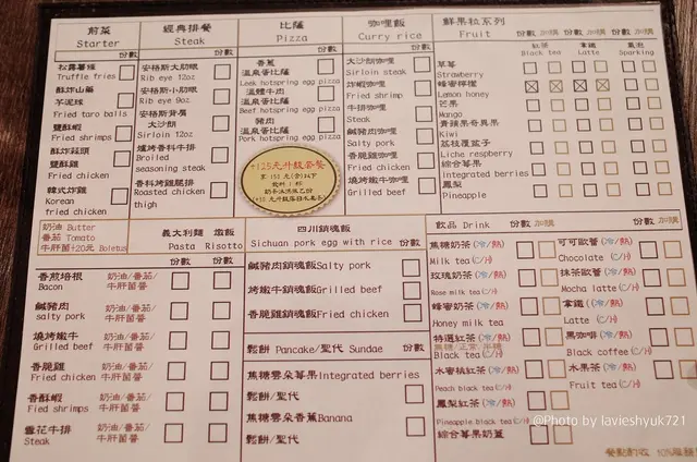 也有提供個人鍋物、牛肉麵、四川銷魂飯、前菜、排餐、披薩、麵食、咖哩飯、鬆餅、聖代等。(特定餐點+$125升級套餐,享$150(含)以下飲料1杯、奶茶冰淇淋乙份。+$30元升級落日水果茶)。