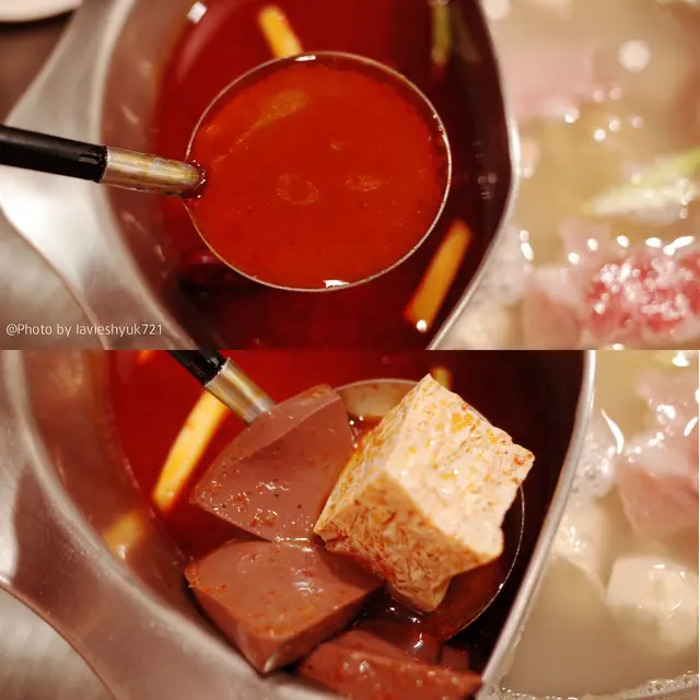 四川麻辣鍋底有鴨血及豆腐,湯頭蠻濃醇的,鹹度剛好,是會讓人回味的順口麻香,吃起來辣得過癮~但若是涮油條或蔬菜這類會吸飽辣油的食材就真的很辣~建議吃小辣的人別輕易嚐試XD 我蠻會吃辣的同事邊吃油條邊喊著好辣~
