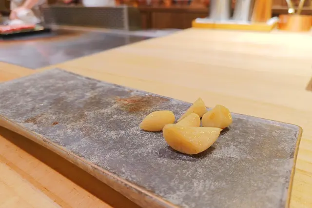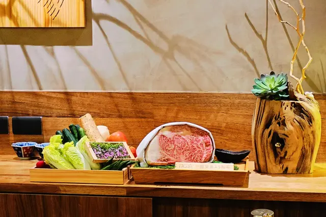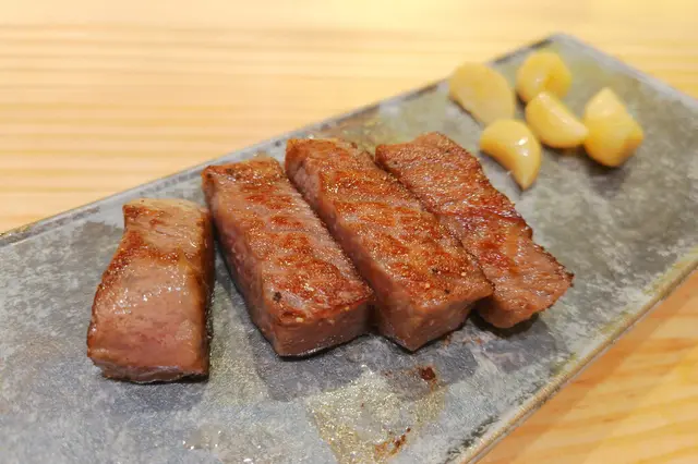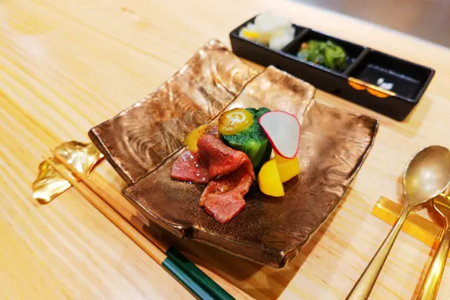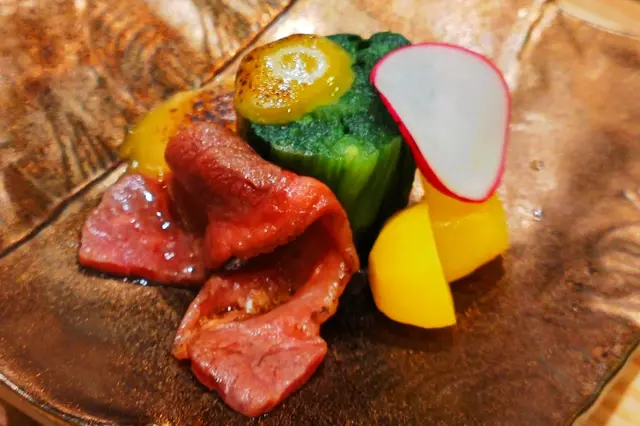 將M9等級的澳洲和牛炙燒過後,搭配季節食蔬一同享用,清爽不膩口,細細品嚐玉味噌醬甜中帶鹹的豐富滋味。