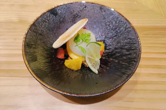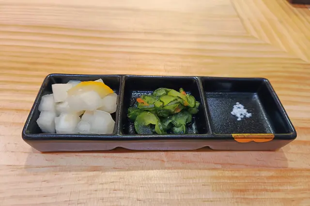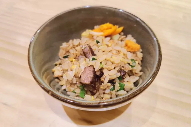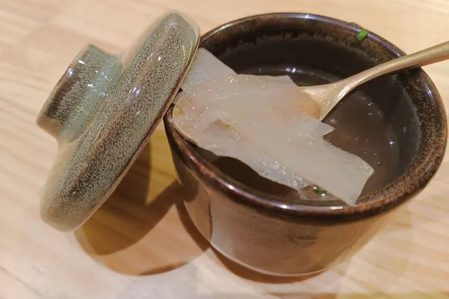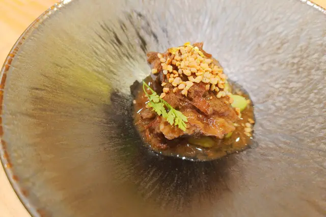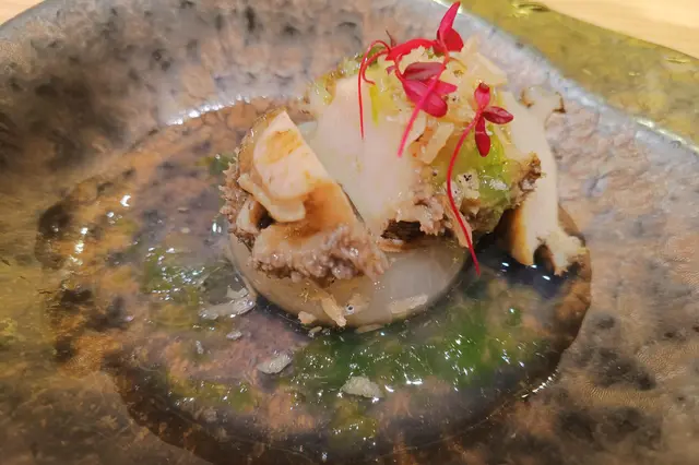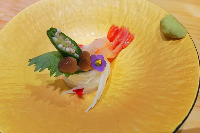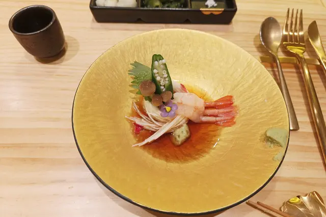 佐以自製的柴魚冷汁一起享用,入口候清爽滑順又甘甜,再擺上甜蝦、鴻禧菇與秋葵增添風味。
