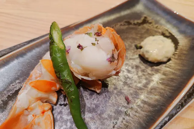 選用來自日本鹿兒島的〈赤猿燒酎〉將龍蝦炙燒過後,搭配自行研發的沾料~蒜味蛋黃醬,