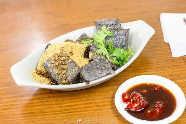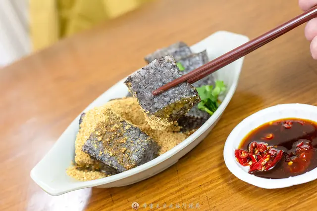 米血糕上面是灑滿花生粉跟香菜,很像是外面賣一整條的豬血糕,咬下去本身帶有Q度還有一點黏稠的感覺,花生粉的香甜還蠻搭的,但最喜歡再沾一點辣椒醬油,吃起來更夠味。