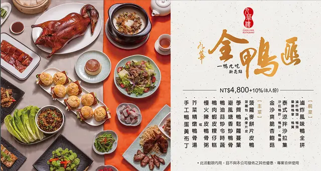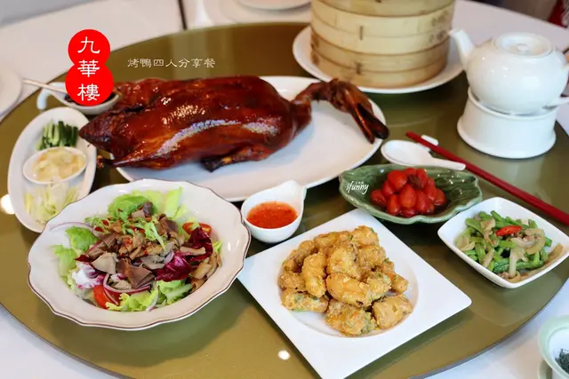 華泰王子大飯店的九華樓提供廣式片皮鴨及道地粵菜,以傳統純正手路,展現經典粵菜的精華。近期推出的烤鴨四人分享餐,可以嚐到創新的麥餅跳舞片皮鴨還有帶點台南風味的蛋白鴨骨湯泡飯等精緻美味,令三五好友小聚,一起體驗色、香、味,意、形的多重享受。