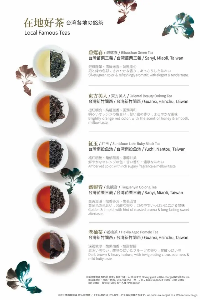 茶資一人$80,這五種茶葉分別是碧螺春、東方美人茶、紅玉紅茶、鐵觀音、老柚茶,每種茶的特色服務人員會一一介紹。