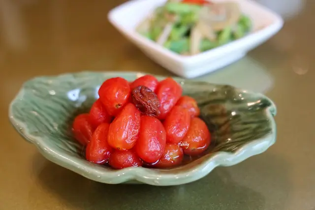 點選四人分享餐,會附兩份小菜,每日小菜口味略有不同;我們這天吃到小菜是清炒四季豆和梅漬番茄。
