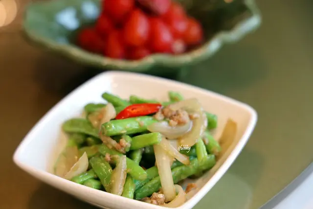 以洋蔥、肉末拌炒的四季豆,口味家常滋味爽口,一下就掃盤。
