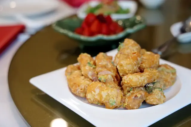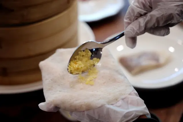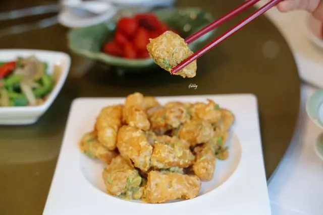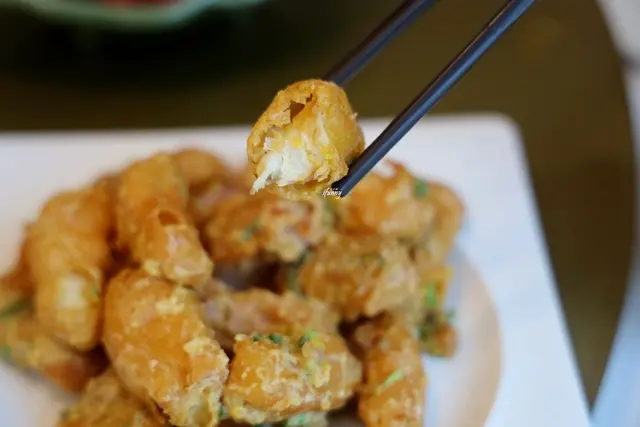 看這剖面,是不是很像雞肉呢?其實是貨真價實的杏鮑菇。厚實的杏鮑菇外層裹上麵衣,再下鍋油炸到酥香,最後再滾上一層鹹蛋黃。一近鼻鹹蛋黃的香氣撲鼻而來,咬上酥脆的外表,杏鮑菇脆彈的口感與濃香的金沙,入口濃郁卻不油膩。