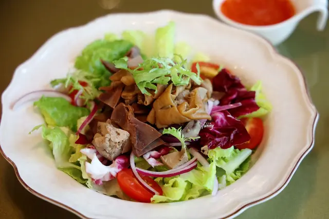 套餐內含兩道前菜:泰式涼拌沙拉集、金沙爽脆杏鮑菇。