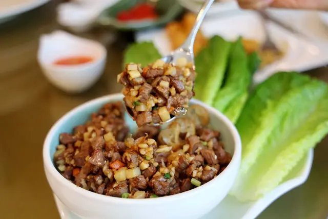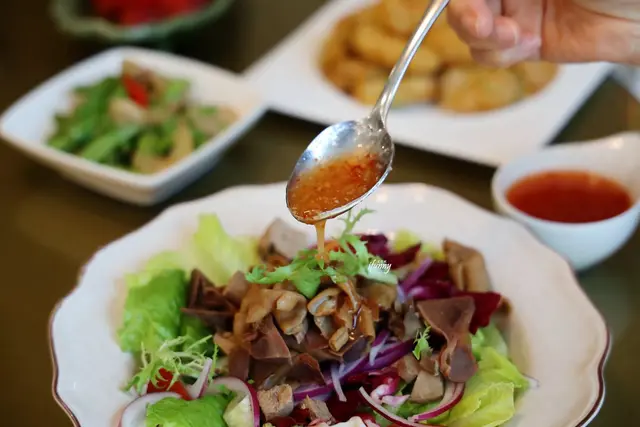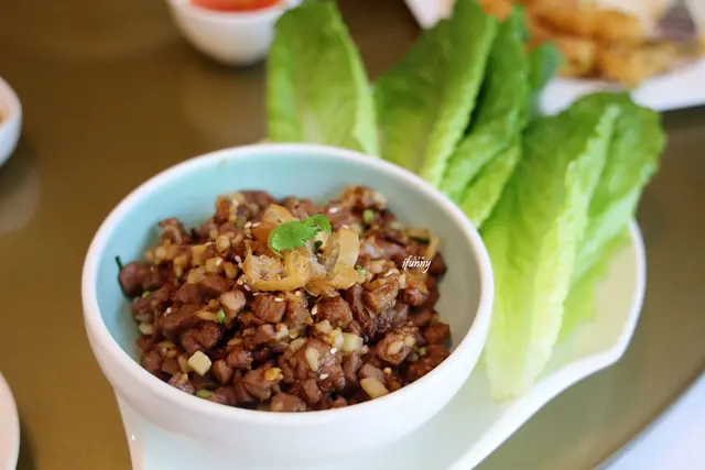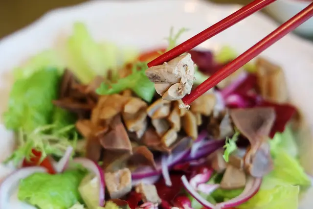 帶點靭性的鴨胗、軟嫩的鴨肝及清脆的鴨腸,再配上蔬菜的清爽,調以泰式甜辣醬汁,創新的吃法特別地清爽開胃。