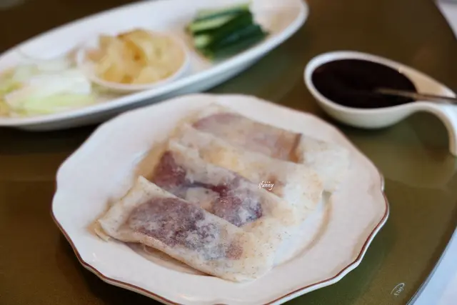 在麥餅上放上小黃瓜條、蔥白、酸薑片、鴨肉,再淋上甜麵醬,自行組合而成的鴨肉捲餅,入口後的皮脆肉香,就是大大的滿足啊!