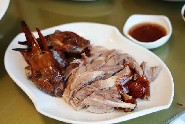 九華樓從選鴨開始,鴨身內的填料、風乾、烘烤、到淋油的過程,每一個步驟都很講究。選用的是北京種的宜蘭鴨,身重約3.5~3.8公斤,油脂飽滿且均勻。