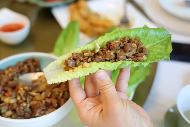 爽脆的蘿蔓葉,放入口感豐富的鴨鬆,一起咬下後層層疊疊的滋味在口中綻放。
