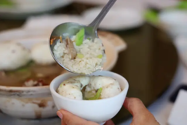在這圓球下正是以鴨骨熬煮的高湯沖成的湯泡飯。