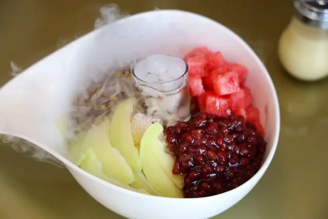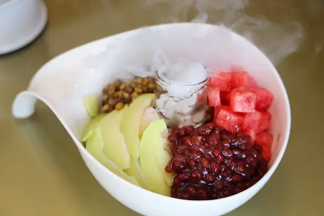 上桌迷幻乾冰繚繞,相當地吸睛。搭以滿滿的紅豆、綠豆、情人果、西瓜,再淋上超誘人煉乳,屬於夏天的古早冰品,是這次烤鴨餐的完美結局。