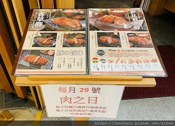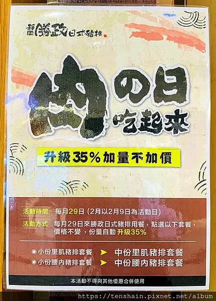俗話說"「事出反常必有妖!」還沒到正常的用餐時間,就大排長龍,這個反常的現象頓時引起我們的興趣。走近一看餐廳門口的菜單,才發現原來每月的 29 日,是「靜岡勝政日式豬排」的「肉之日」。只要在「肉之日」點"小份腰內豬排套餐"、或是"小份里肌豬排套餐",份量立馬升級 35% ,從"小份"自動升級成"中份"。有句話說:「來得早,不如來得巧」,這種好康既然被我們撞見了,哪有放過的道理?那就跟著大家一起排吧!