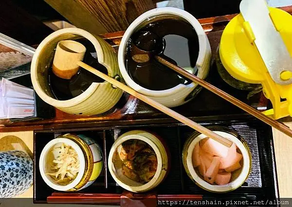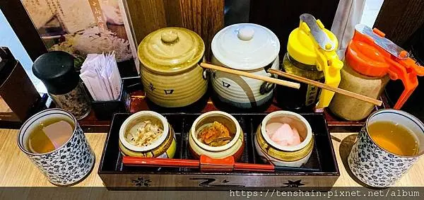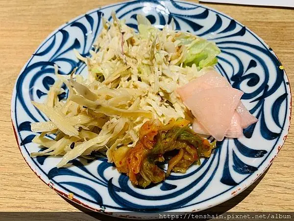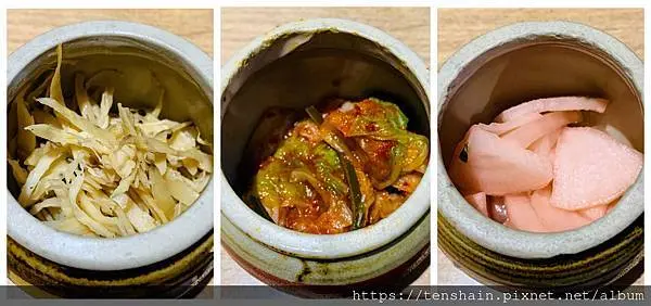 小菜是一次性的,意思是不能續。牛蒡有嚼勁,甘甜順口,還有芝麻的香氣,會讓人一口接一口。泡菜我個人比較不喜歡,因為它不像台式泡菜那麼酸甜爽口,也不如韓式泡菜,酸辣得很有特色,相對起來就是味道比較平庸。醃漬大根呈漂亮的粉紅色,爽脆的口感中,有梅汁的酸甘。