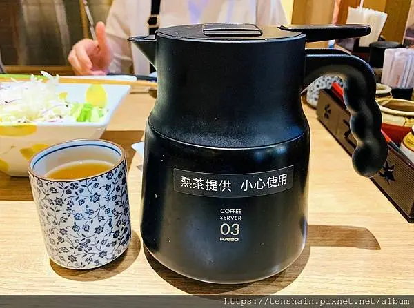桌上還有一個保溫熱水壺,茶杯裡的茶喝完了可以自己補充。這茶是"靜岡綠茶",用來解膩很有用,但茶溫很高,喝時務必小心。