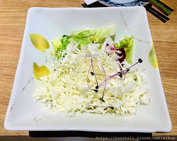 高麗菜絲是吃日式豬排不可或缺的蔬菜,「靜岡勝政日式豬排」的高麗菜絲口感細緻,沒有粗硬的纖維,清甜爽口;還有一些美生菜,增加口感的豐富度。
