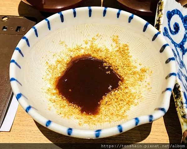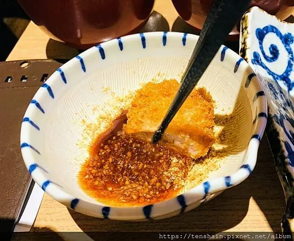 磨了半天的芝麻沾醬不用可惜,沾了醬汁之後,"腰內豬排"的香氣更多元,口感也多了甘鹹味,用來搭宜蘭的"越光米",兩者相得益彰,堪稱絕配。
