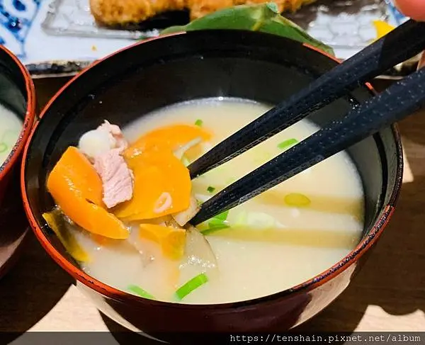 "豬肉味噌湯"多了豬肉絲、紅蘿蔔,鮮甜味多了些,鹹味就感覺淡了一點。兩種味噌湯都可以續,而且可以續不同的湯,交換喝看看也不錯。
