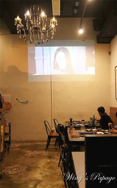 一樓約有三張4人桌,牆面上投影播放韓國流行音樂節目,
