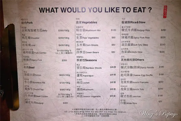 Menu,燒烤食材提供各式豬肉、牛肉、蔬菜,