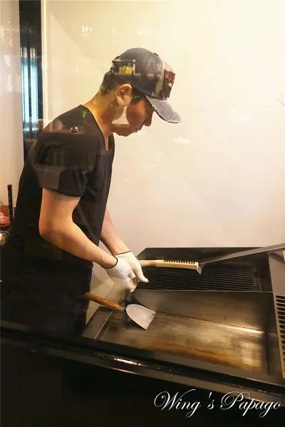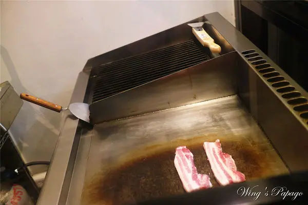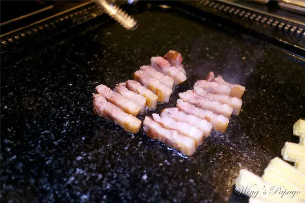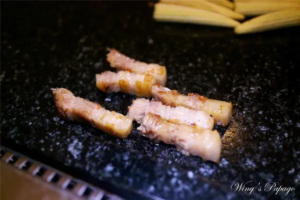 由老闆親自在燒烤室先初步烹調豬五花,等到一定熟度後再移到桌面石板上。