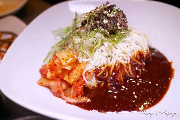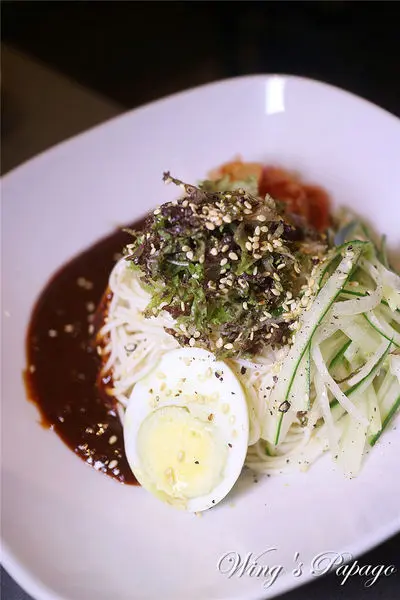 這道韓式涼麵有豐富的配料如韓式泡菜、小黃瓜絲、生菜、海藻絲等,