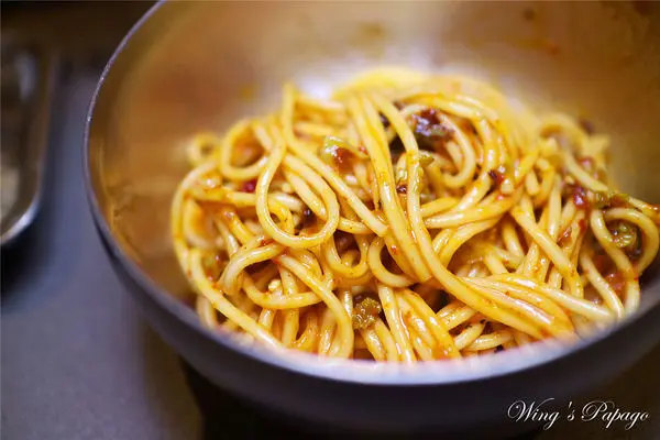 將所有配料及醬料拌勻後食用,麵體富有Q勁,辣醬辣中帶甜,