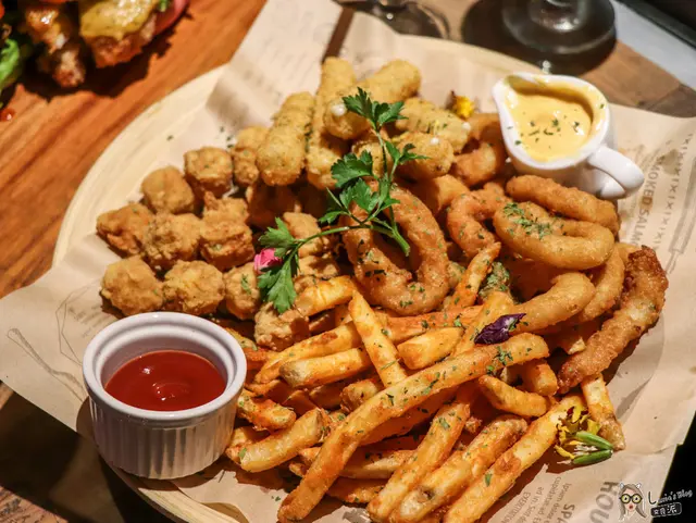 小雞塊、薯條、洋蔥圈、起司條, 分量很多四個人絕對夠吃不用搶,每種炸物的水準也都很不錯