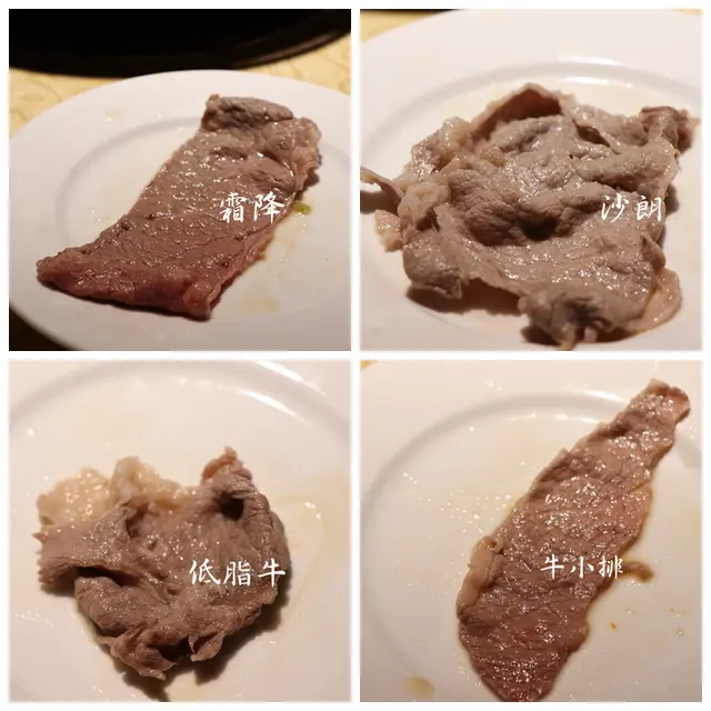 霜降油花最為細緻,比例適中,入口相當軟嫩滑順,油香與肉香交織讓人忘卻人世間的煩惱阿...。莎朗也嫩,但相較霜降比較有咬勁。低脂牛雖然低脂但吃起來並不柴,牛肉香氣頗為明顯。牛小排油花最多最肥,與霜降同等軟嫩好入口。我個人排名 霜降>牛小排>低脂牛>莎朗,但每人喜歡的口感不同,僅供參考囉。基本上肉質都是好,只是好與很好與非常好的些微差異。如果你是牛肉控,這四種部位的牛肉套餐絕對讓你覺得物超所值。