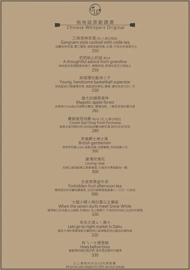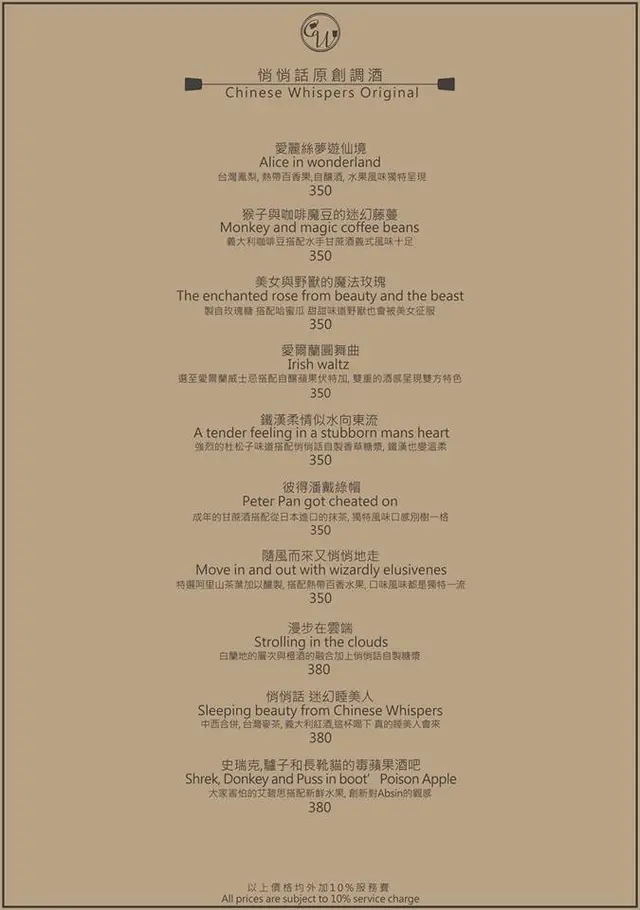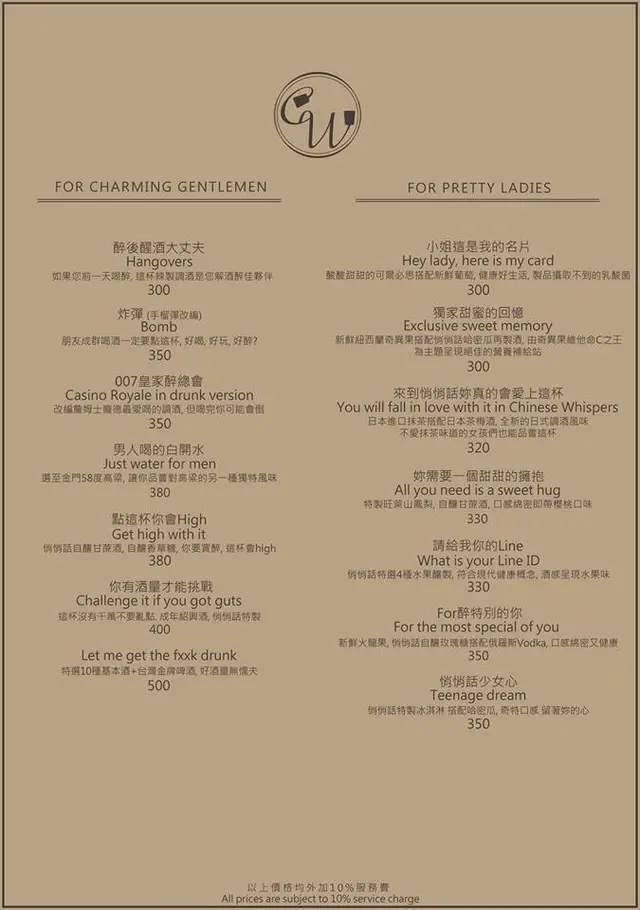 『Chinese Whispers悄悄話餐酒館』的環境空間很大,氣氛舒適。餐點口味有些喜歡也有些不合我胃口,但食物這種東西本來就是各人口味大不同了。調酒的部分很有特色,有多種獨門創的調酒,酒量好的人可以來試試,我倆酒量是有點弱XD。另外想稱讚服務,服務生妹妹好正阿阿阿阿阿阿阿,且不是臭臉正妹,是笑咪咪服務好好的正妹阿,真令人心花怒放(癡漢模式開啟),收桌子、介紹餐點與各種服務都很用心親切,有問必達,我想會對於這間餐廳的印象加上不少分。