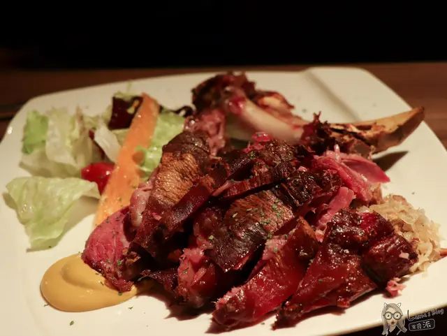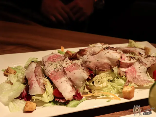 半生熟的牛肉雖是薄切,但軟嫩中帶有些口感我挺喜歡,本身沒有什麼肉味,配上起司提味,還有清爽的生菜與麵包丁。