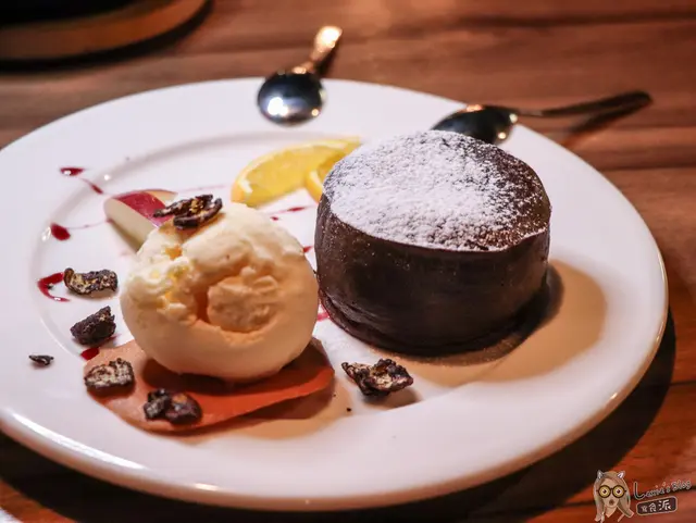 現烤甜點需要15min時間製作,巧克力融岩是不敗甜點,切開的一瞬間一定要看到瀑布般的巧克力流出來才可以。整體調味適中,巧克力帶苦味,我喜歡這個口味。但外皮口感可以再改進,有點潤潤的(台語)。我喜歡外皮是有點酥脆度的熔岩巧克力。