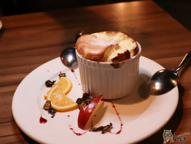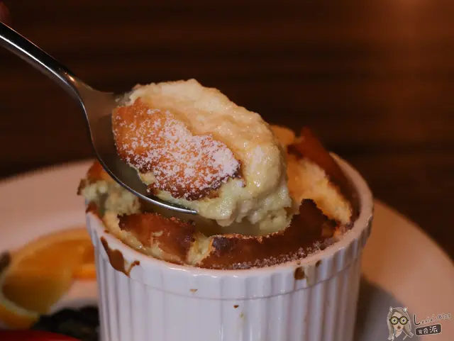 舒芙蕾一端上來就蛋香四溢,挖開中心是完美的水潤度,雖然它不算長得很高,但表皮焦香、中心的半熟度,杯口糖圈與整體調味都很到位,是挺好吃的舒芙蕾。
