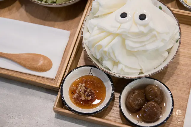 我們選擇白色巧克力豆和蜂蜜桂花凍來搭配這份冰品,白巧克力豆配在米色的冰上畫面很好看,不過口味上偏甜一些,