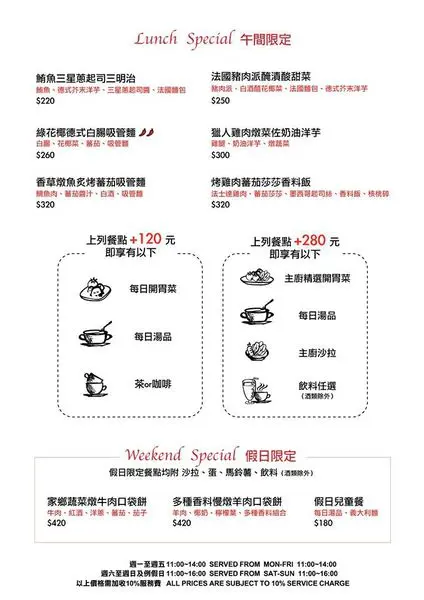 除了有一般單點的菜色之外,也有午間限定及假日限定的套餐可以選擇喔