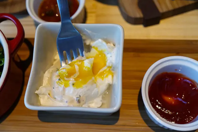 ▲配菜的蛋料理,裹上塔塔醬的半熟蛋,還蠻好吃的!