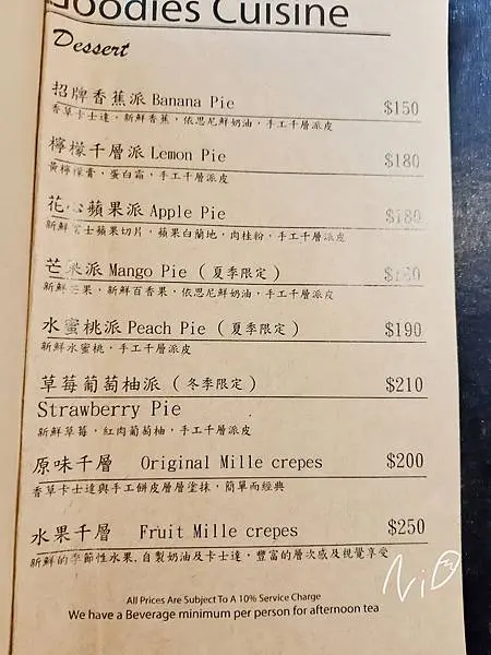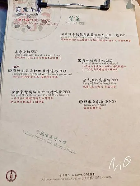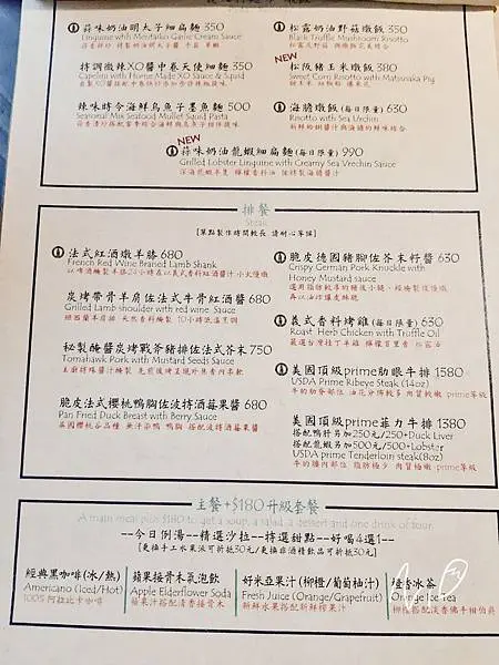 餐點介紹:前菜/米麵/排餐/套餐/甜點/酒;午晚餐低消 NT 700/人