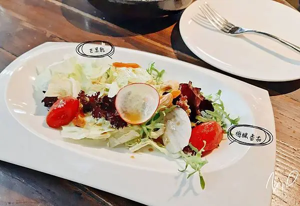 百香果油醋醬搭配新鮮生菜很開胃,不過盤底積了不少油醋