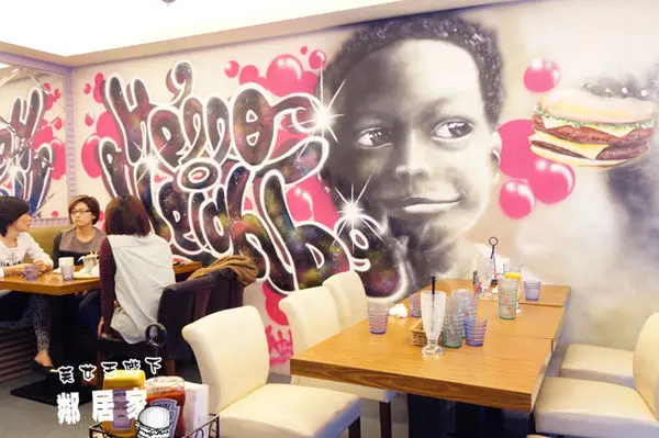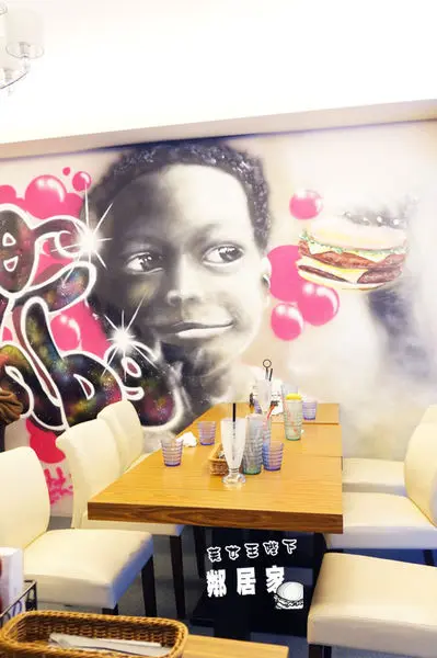 牆壁大大的是黑人小孩拿著大漢堡很滿足的樣子